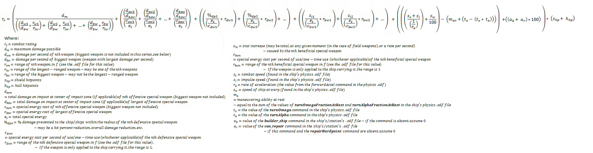This formula lets you calculate how the AI will react to your ships. It encompasses a number of factors, from the amount of damage produced by the weapons to the bonuses afforded it by the special weapons, and even its maneuverability and ability to repair other ships. A complete list of variables is included in the file.